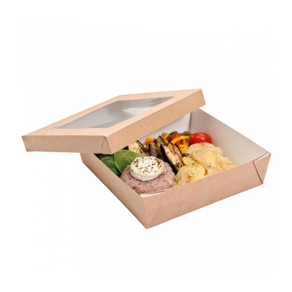 Купить Ланч-бокс с крышкой (с окном), влагостойкий, 750 мл,14*14*5 см, (1упаковка =25 шт),коричневый картон
